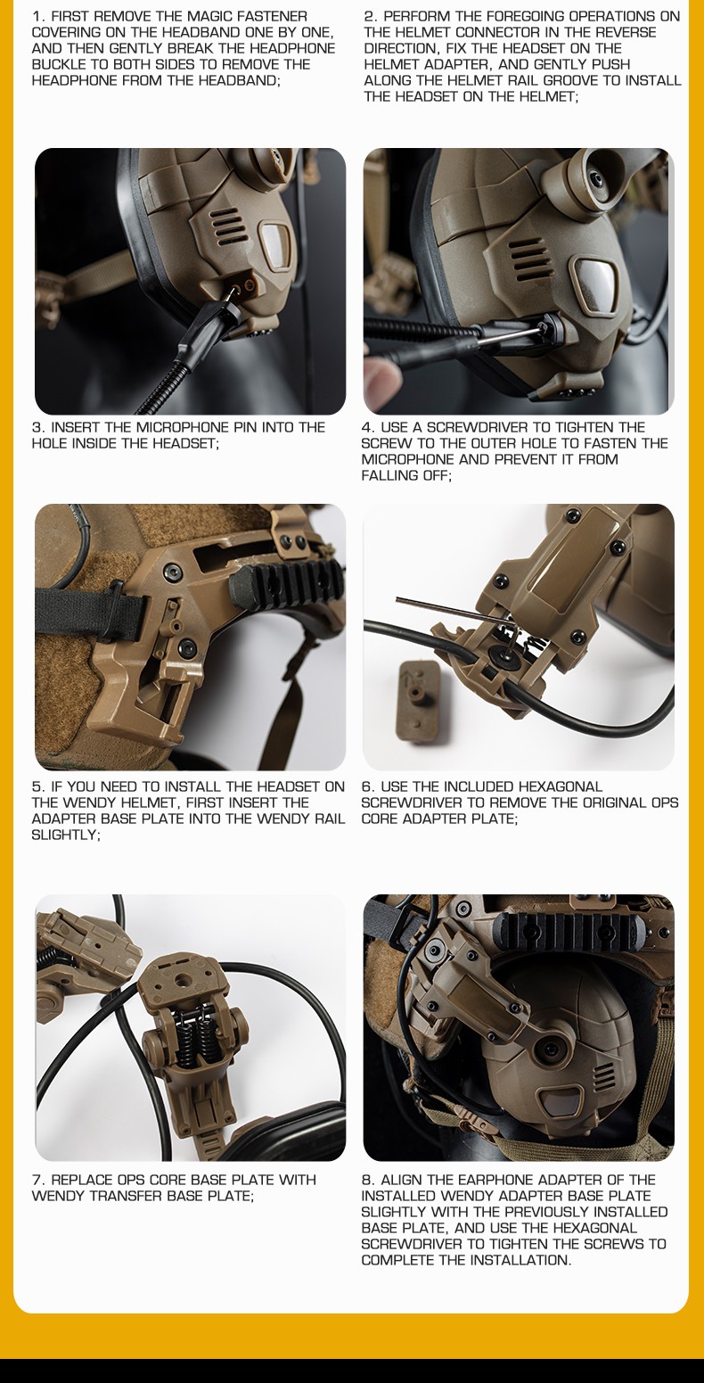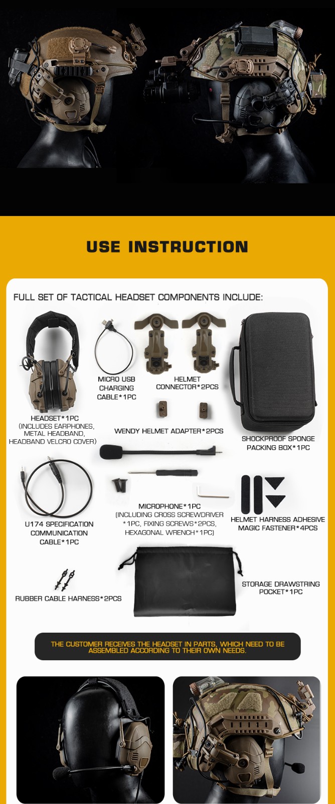 Headset*1pc, microphone*1pc, communication cable*1pc, helmet connector*2pcs, rail conversion piece*2pcs,package box,storage pocket,tools