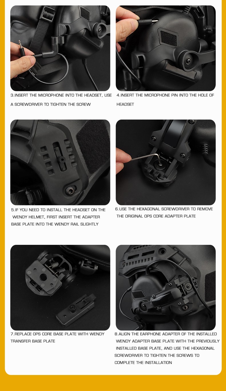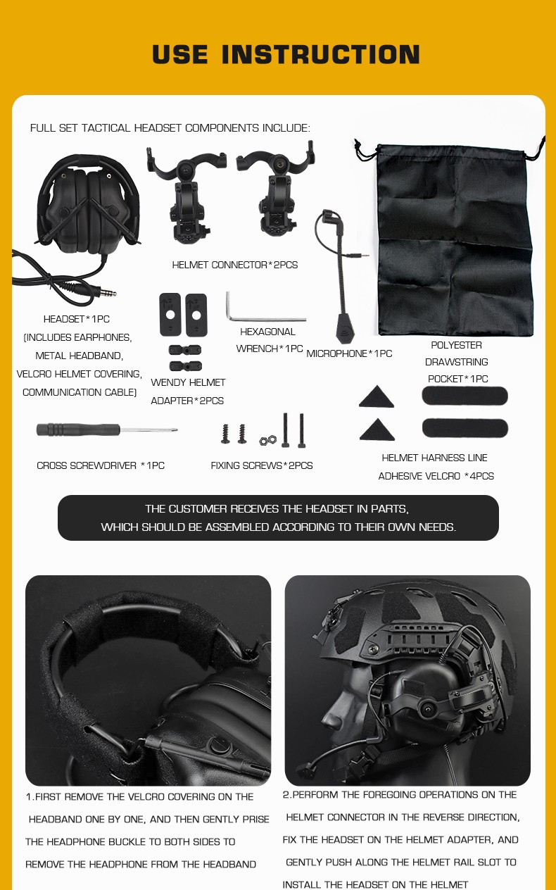 Headset*1pc, microphone*1pc, helmet connector*2pcs, rail conversion piece*2pcs,drawstring pocket*1pc