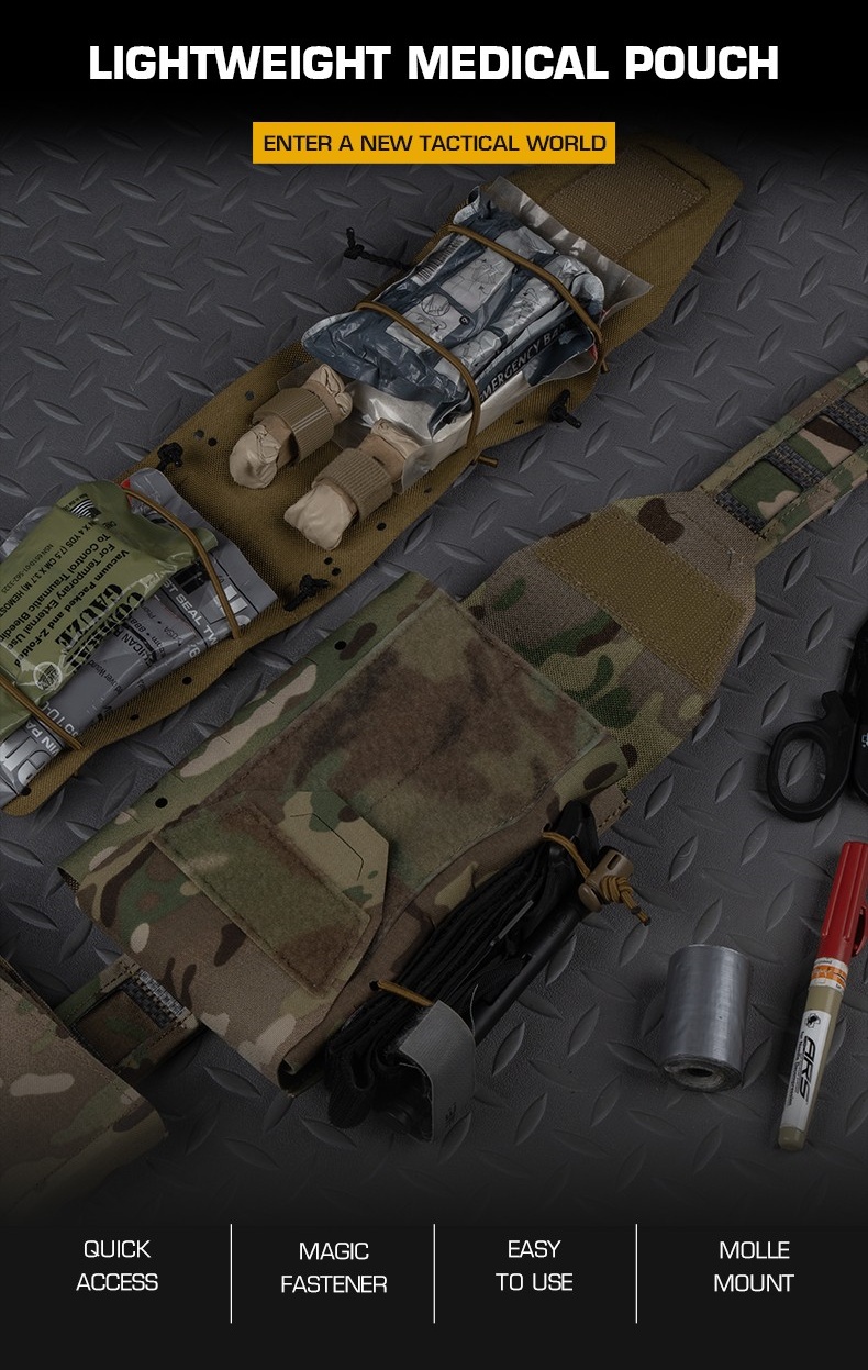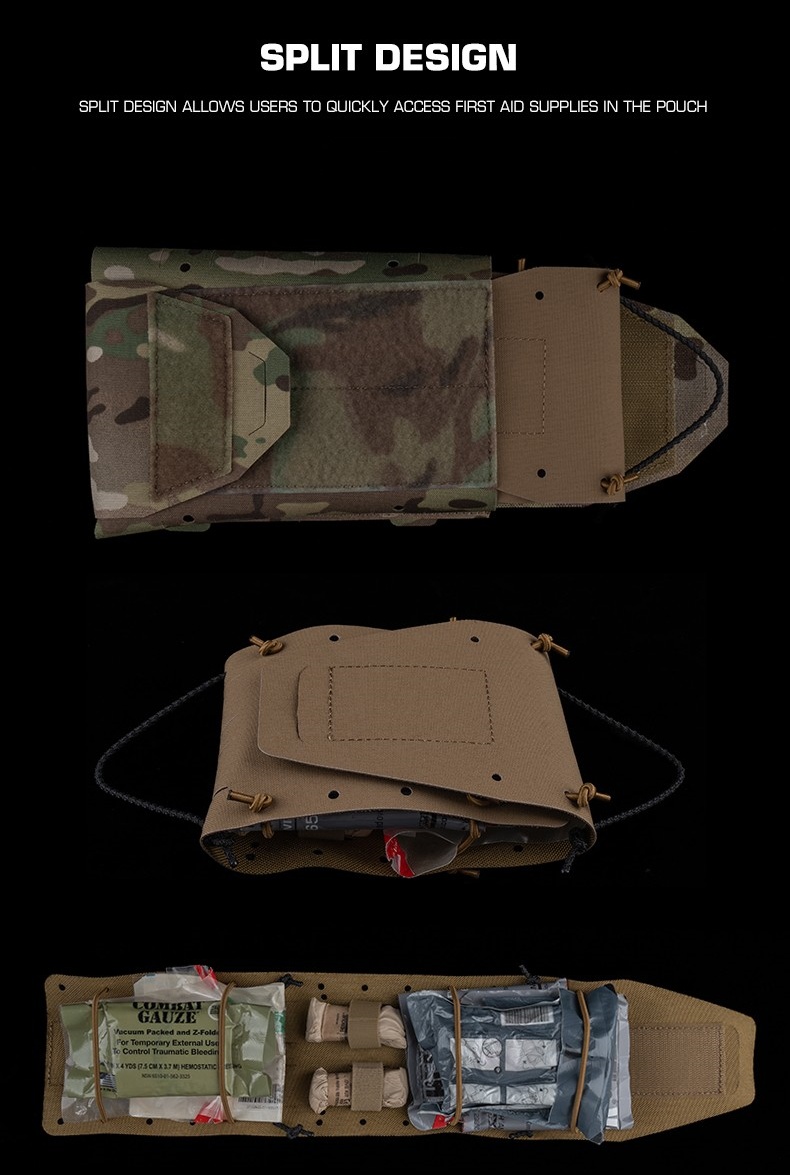 The tactical split design enables quick access to the first aid supplies inside the bag, making it a lightweight medical kit